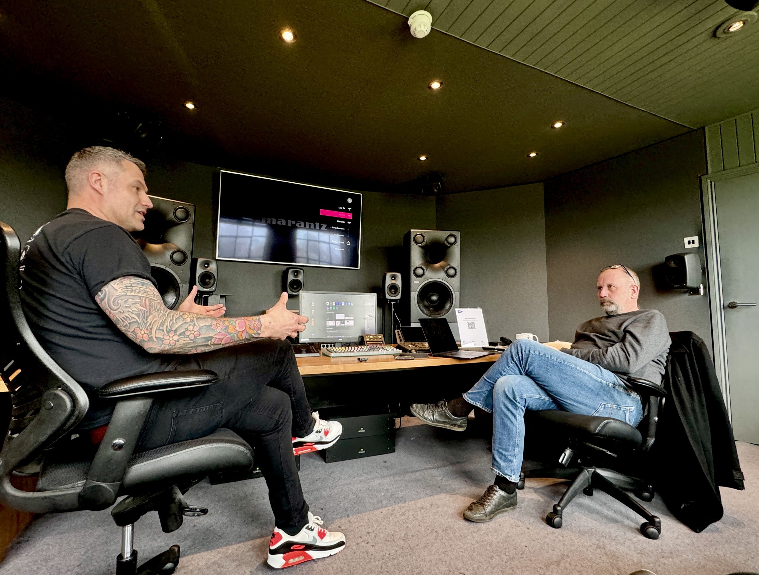 Above: Andy Bensley of Genelec and Andy Jones discuss the 8381As at HHB London.